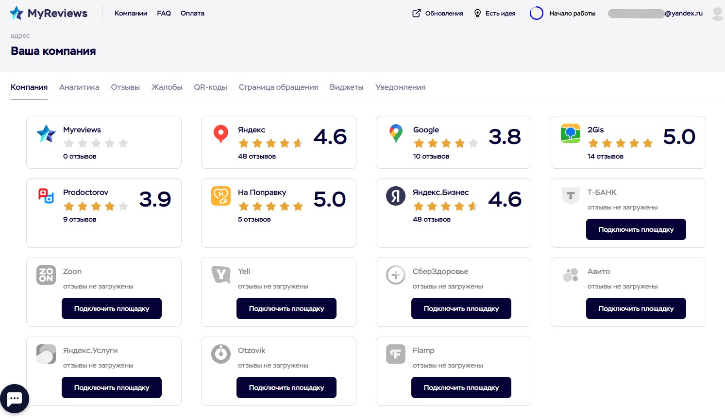 MyReviews — это многофункциональный сервис, который помогает собирать, анализировать и управлять отзывами с различных онлайн-площадок, таких как Google Maps, Яндекс.Карты, 2GIS, а также специализированных платформ, например, ПроДокторов или Flamp. Всё это доступно в едином удобном интерфейсе.